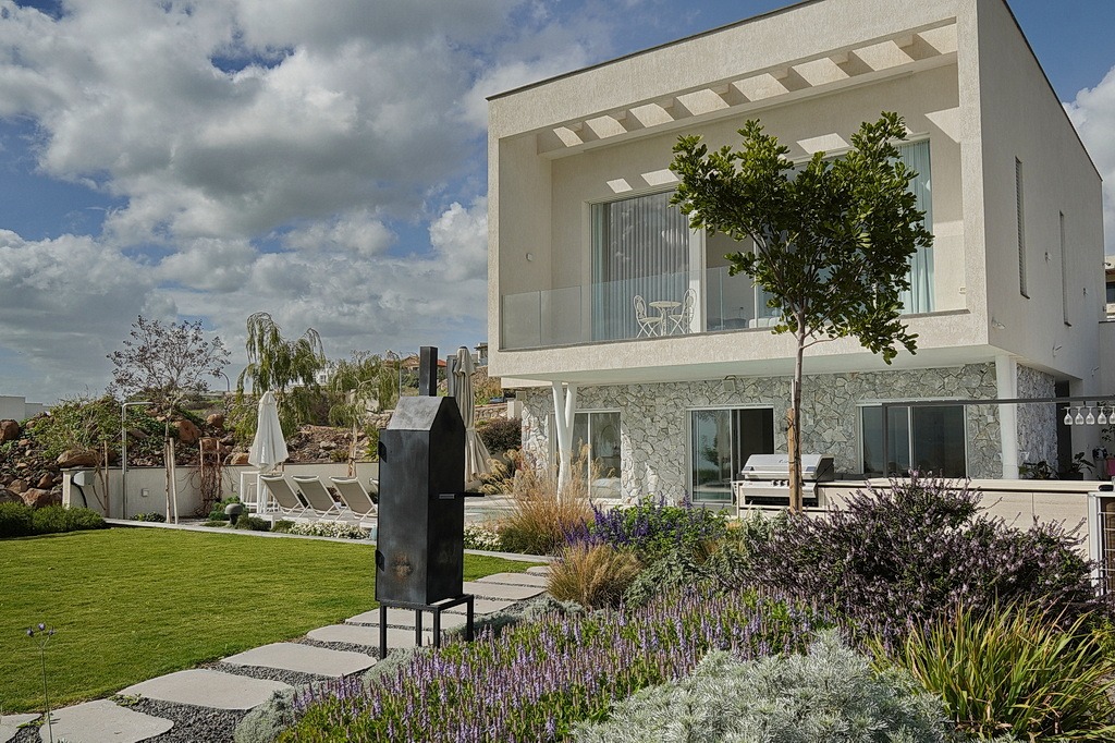 וילה פרטית מול נוף פתוח לכנרת, עם גינה רחבה ואזורי ישיבה הפונים אל הנוף.